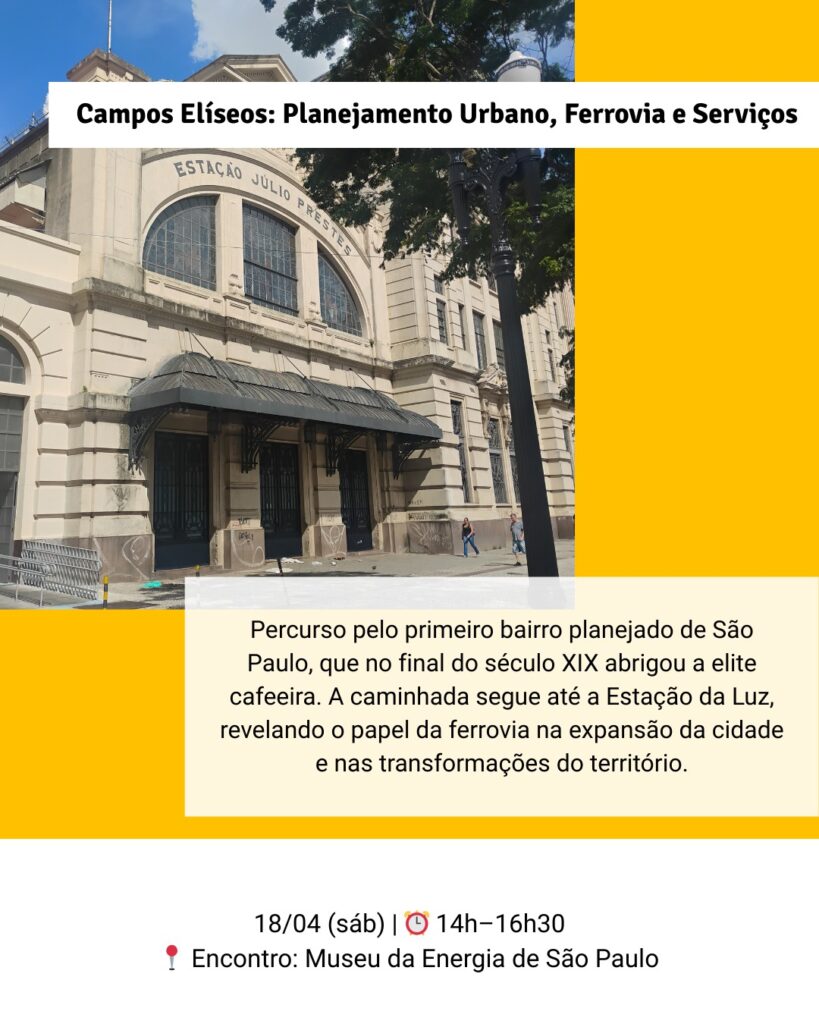 No dia 18 de abril, realizaremos a primeira caminhada dessa iniciativa: Campos Elíseos — Planejamento Urbano, Ferrovia e Serviços.