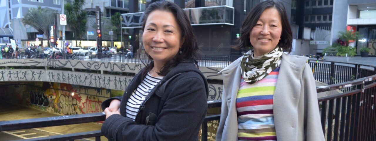 Marcia Chicaoka é formada em design. Trabalhou por muito tempo na área editorial. Atualmente cria flores de papel, para eventos e vitrines, com a marca Chicaoka Papel em Flor. Carmen Fukunari é editora de arte numa media tech. Trabalha com edição de fotos, gráficos e infográficos. Quem hoje vê as duas em seus trabalhos (ou fora deles) não desconfia que elas formam uma dupla fundamental na história da arte urbana em São Paulo. Pouca gente sabe que, nos anos 1980, Carmen e Marcia foram, até onde se sabe, as primeiras mulheres a empunhar latas de spray na quase inteiramente masculina cena do grafite na cidade. “A gente sofreu um apagamento, pra falar a real”, afirma Carmen. Na época em que a dupla começou a grafitar, nos idos de 1988, não existia rede social. Não existia site. Não existia internet. No caso do grafite, portanto, o apagamento é literal. A obra não sobrevive. Essa efemeridade do meio é da natureza da arte urbana. Como boa parte de seus pares, a dupla não tinha registros de sua obra – exceto por algum material no Centro Cultural São Paulo, graças ao trabalho de Maria Olimpia Vassão, pesquisadora de artes visuais para a Coleção de Arte da Cidade. A produção delas começa para valer quando Carmen entra na faculdade de Design, em 1990. “A gente até brincava um pouco antes”, afirma Marcia. “Mas não sabia nada da técnica.”