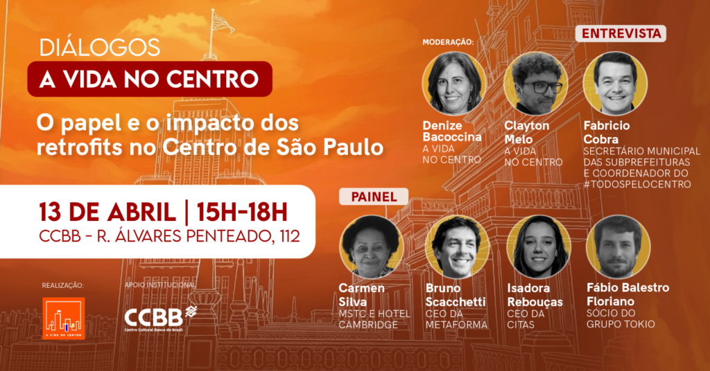 Com mediação de Denize Bacoccina e Clayton Melo, sócios e fundadores do A Vida no Centro, o evento propõe uma reflexão sobre habitação e desenvolvimento do Centro de São Paulo.